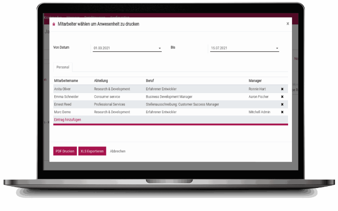 Every attendance entry is logged individually based on the posting principle. Whether you're a manager viewing all employees or a staff member reviewing your own hours—our flexible permission system supports both.