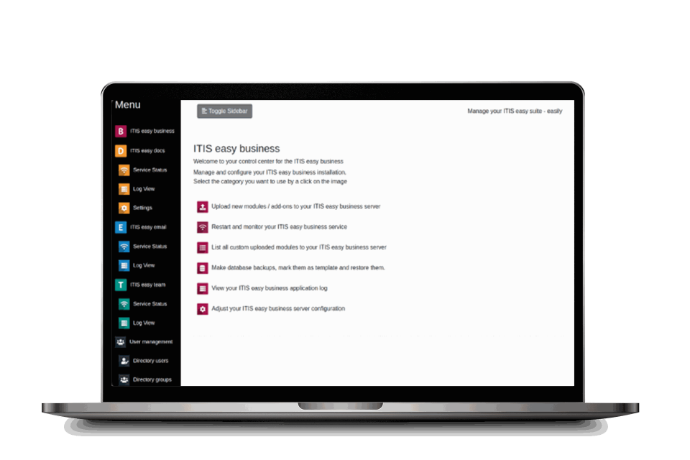 Experience full control of your business software suite with ITISeasy.control-center.